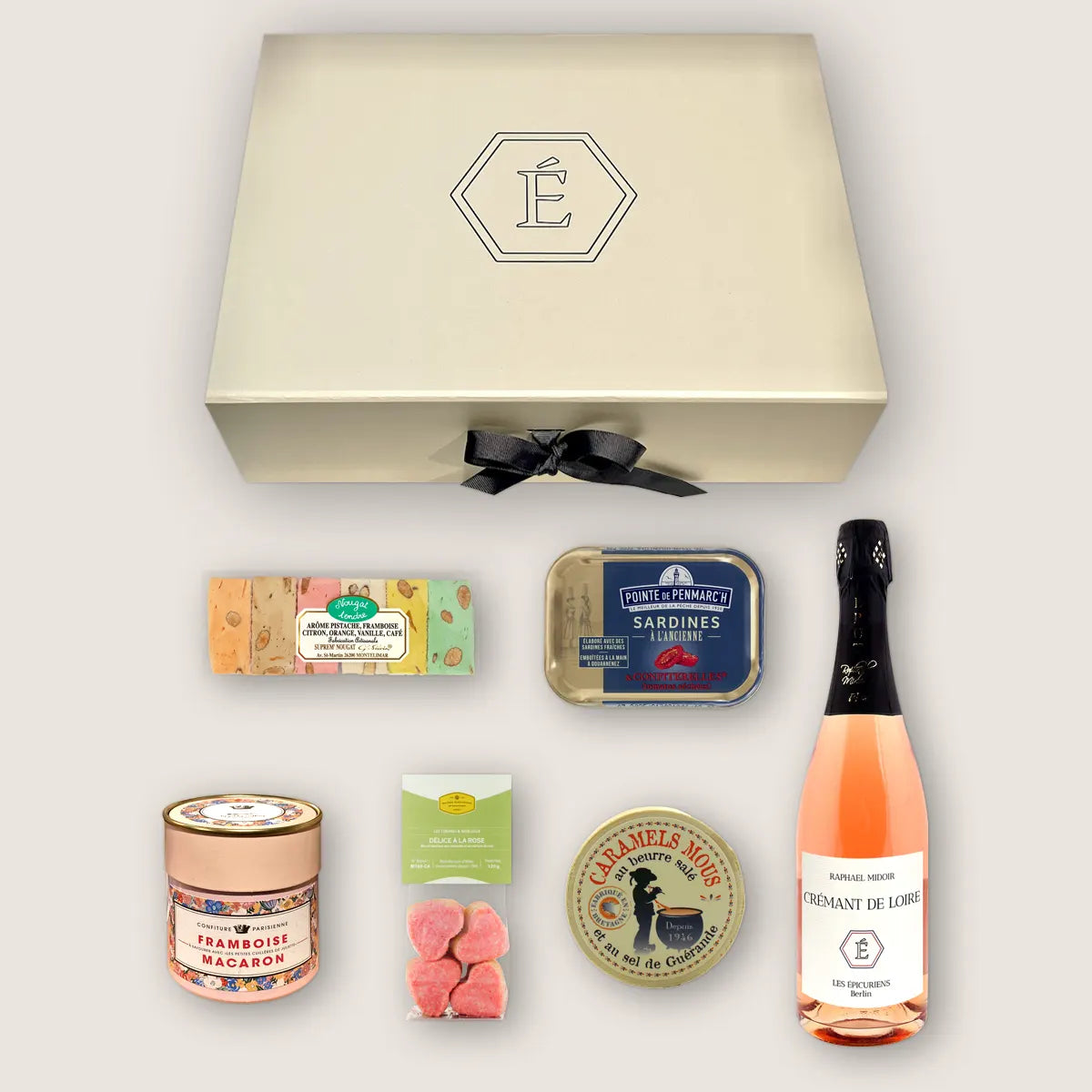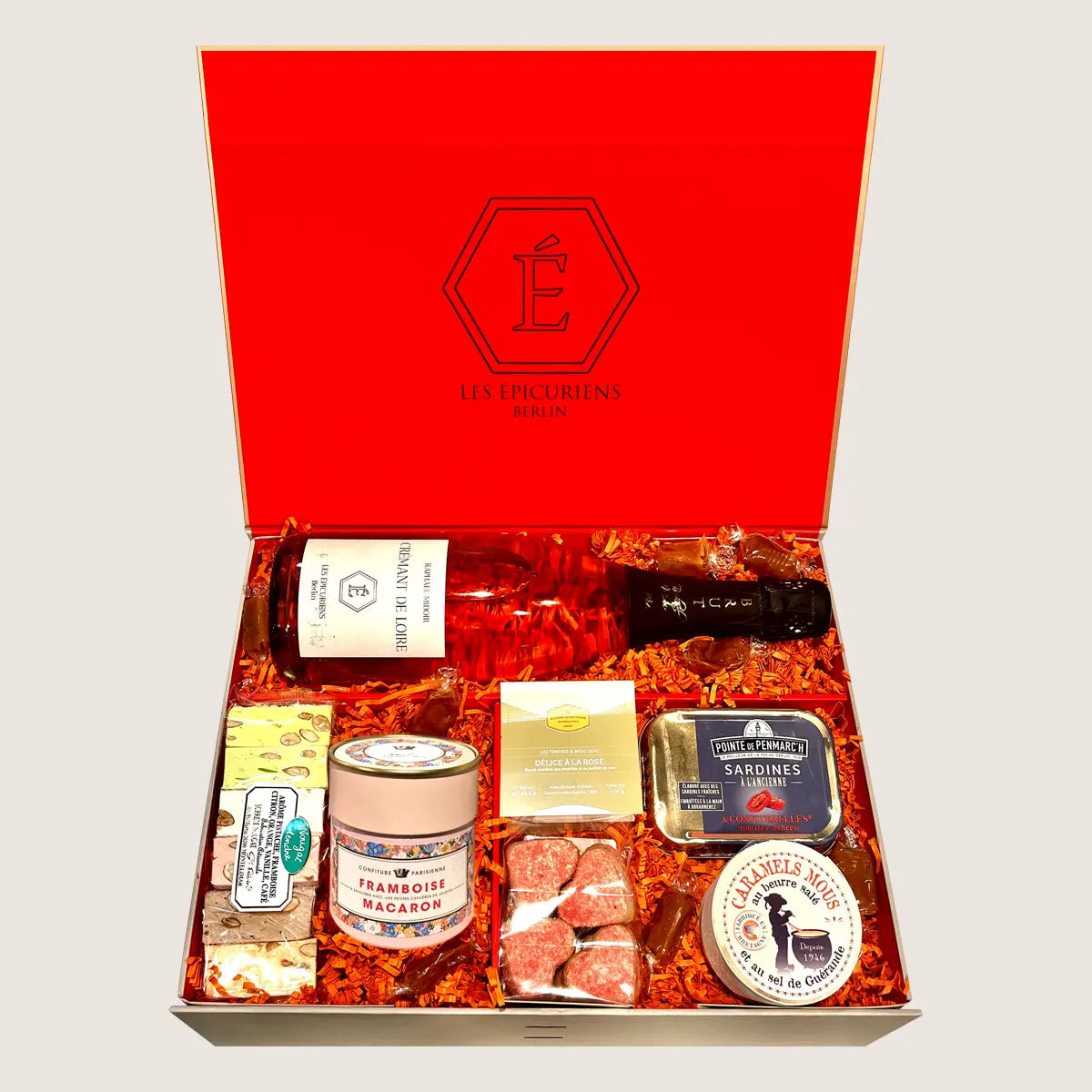 Nicht nur schön anzusehen ist diese Box, sondern auch durchweg köstlich sind die Delikatessen, die wir hierfür zusammengestellt haben, noch dazu begleitet von einer Flasche vorzüglichen Rosé-Crémants von der Loire. Wenn das keine rosigen Aussichten sind!